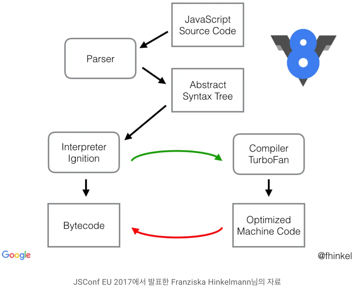 V8은 속도를 위해 인터프리터를 사용하는 대신 다른 JS엔진처럼(SpiderMonkey, Rhino, JSC, etc.) JIT(Just-In-Time) 컴파일러 를 구현해 JS코드를 기계어로 컴파일한다.