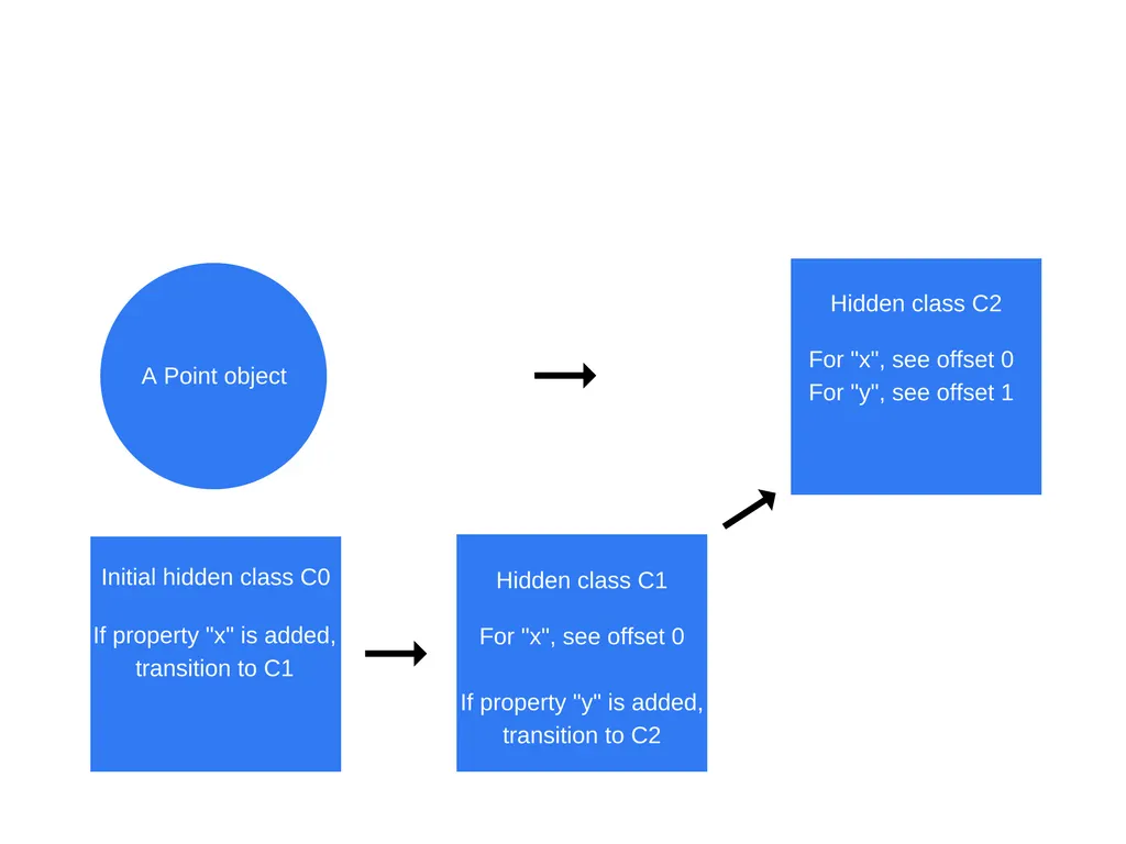 “new Point(1, 2)”가 호출되면, v8은 “C0”라고 부르는 hidden class를 생성할 것 이다.