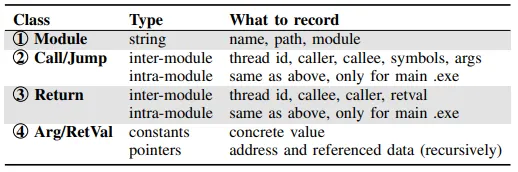 Call/Jump: 모듈간의 control flow를 변경하는 매 Call 및 Jump마다 현재의 thread id, caller, callee, symbols, arguments를 기록한다.