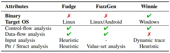 반면, FuzzGen은 소스코드의 정적분석을 통해 하네스를 생성한다. 하지만 Fudge와 FuzzGen은 소스코드를 사용할 수 있는 반면, WINNIE의 경우 binary만을 가지고 분석을 수행하기 때문에, 기존의 하네스 생성 솔루션을 사용할 수 없다.