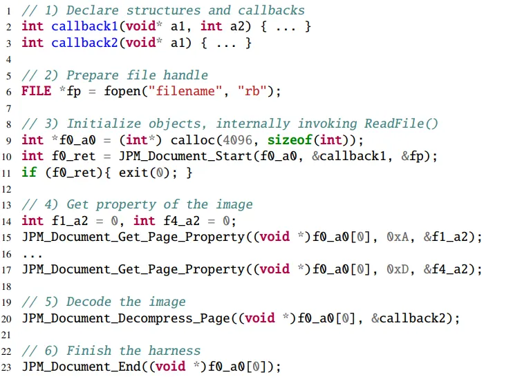 하네스는 타겟 라이브러리와 관련있는 모든 함수 call을 구현해야한다. 이때 주의해야하는 점은 static 분석만으로는 모든 함수 call을 재구조화 할 수 없을 수 있기 때문에(indirect call and jump table, etc.), dynamic 분석도 함께 진행해야 한다.